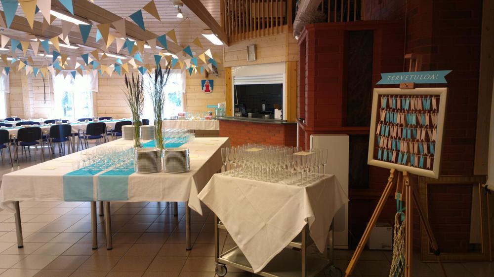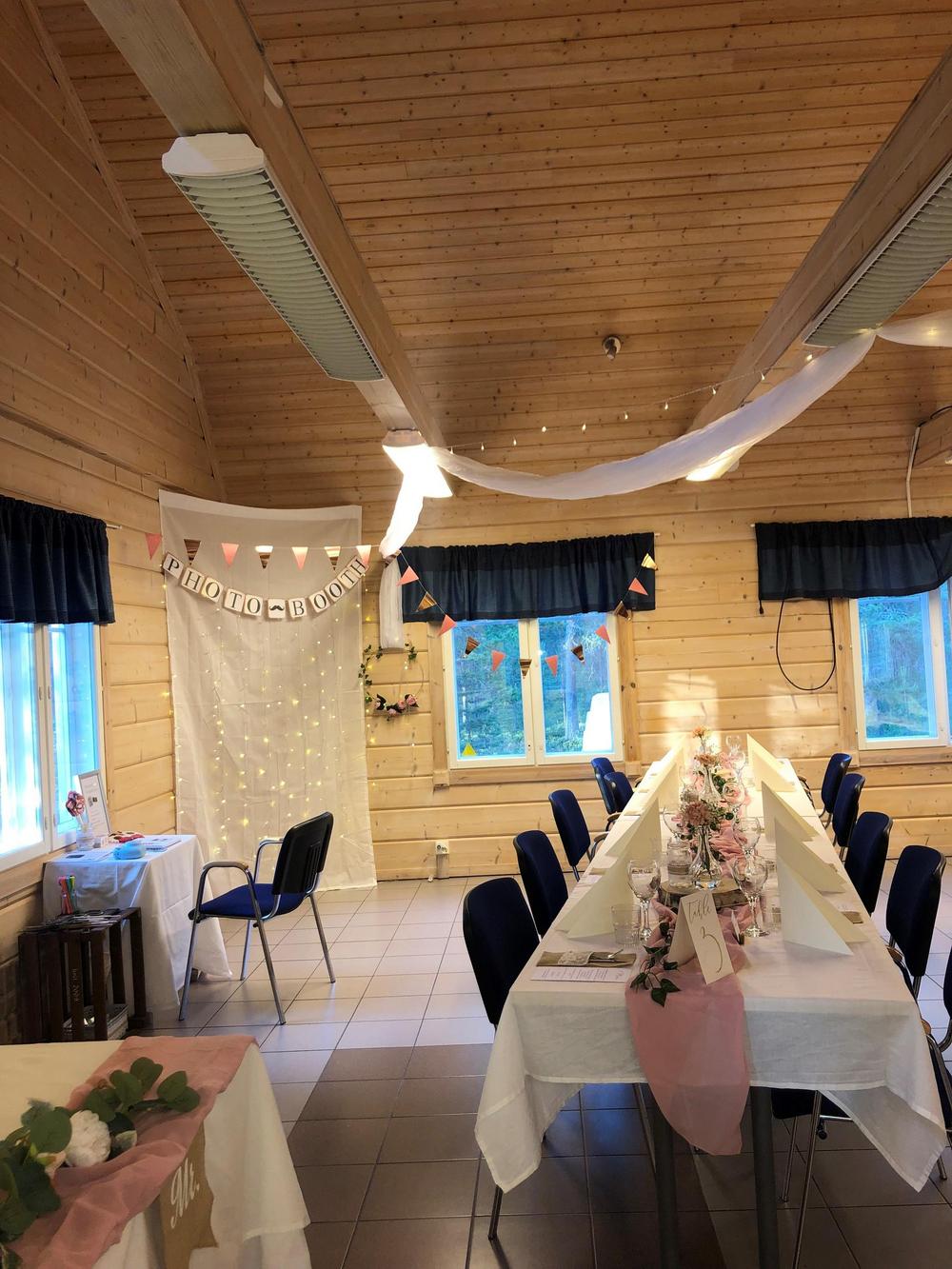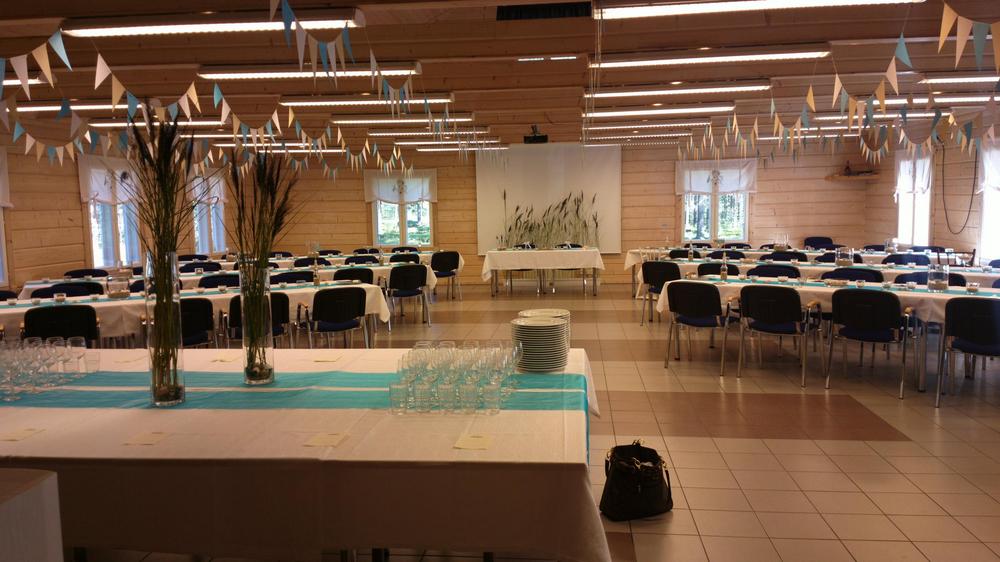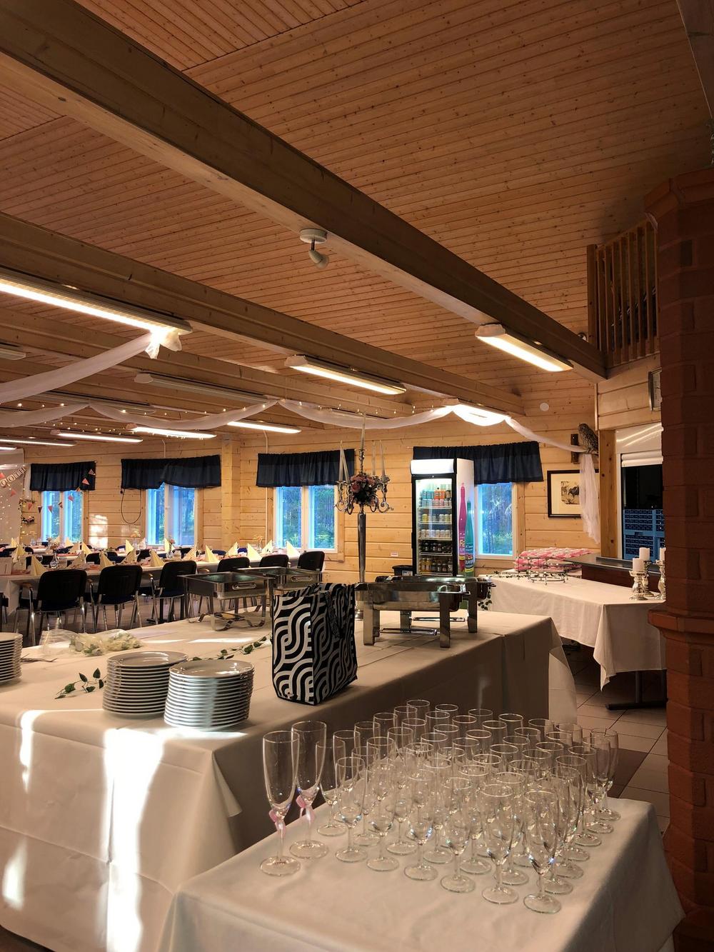 Juhlasalin mitat: pituus 14m leveys 11m, katossa on parruja 10kpl, parrujen väli on 130cm, täyspitkiä on 7 ja lyhyempiä 3. Majalla on pöytiä joiden koot ovat: 220*80cm 20kpl ja 180*80cm 5kpl, värinä on koivu. Valkoisia pöytäliinoja ei ole, vain kaitaliinat pöydillä. Kuohuviinilaseja on n. 80kpl