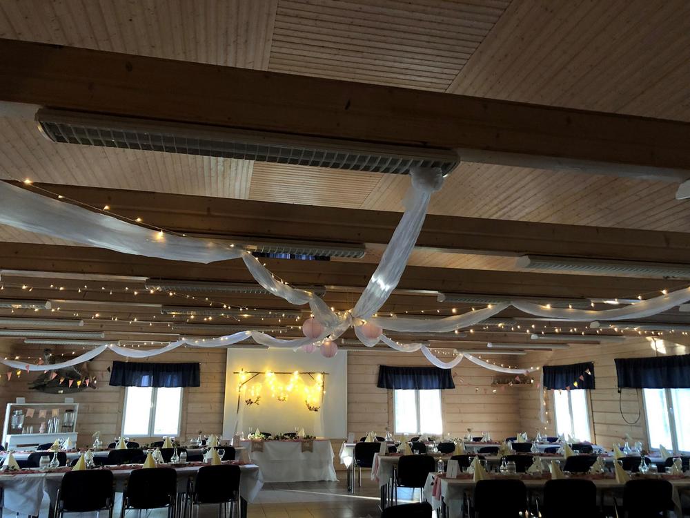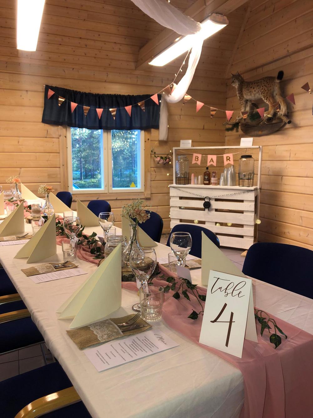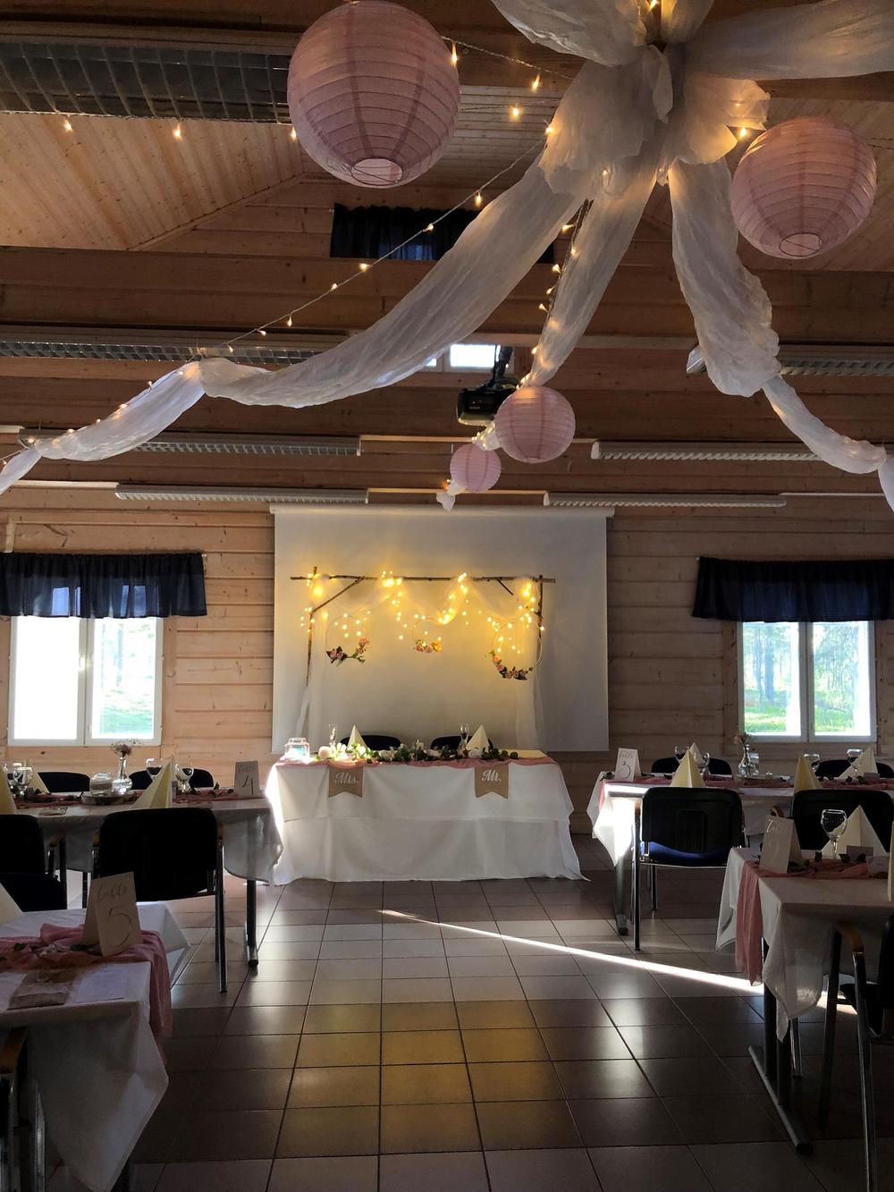 Juhlasalin mitat: pituus 14m leveys 11m, katossa on parruja 10kpl, parrujen väli on 130cm, täyspitkiä on 7 ja lyhyempiä 3. Majalla on pöytiä joiden koot ovat: 220*80cm 20kpl ja 180*80cm 5kpl, värinä on koivu. Valkoisia pöytäliinoja ei ole, vain kaitaliinat pöydillä. Kuohuviinilaseja on n. 80kpl
